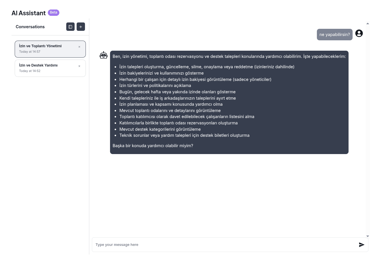 Platformumuz, izin yönetimi, toplantı odası rezervasyonları ve destek taleplerini tek bir sohbet üzerinden kolayca yönetmenizi sağlayan akıllı bir iş yeri asistanı içerir.