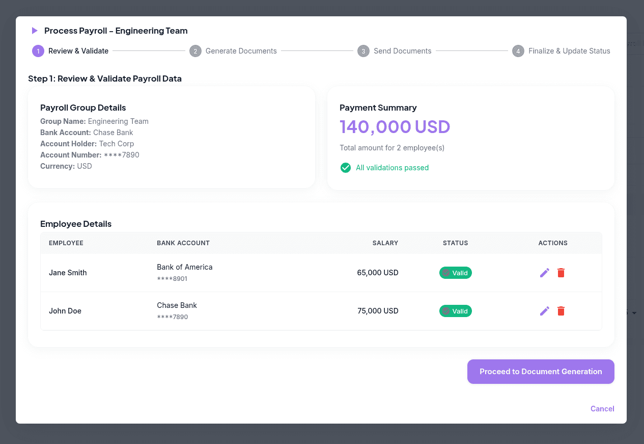 Yapay zeka otomasyonumuz, her ödeme grubu için hatasız ödeme talimatları oluşturur ve bunları önceden tanımlanmış banka yetkililerine otomatik olarak e-postayla gönderir.